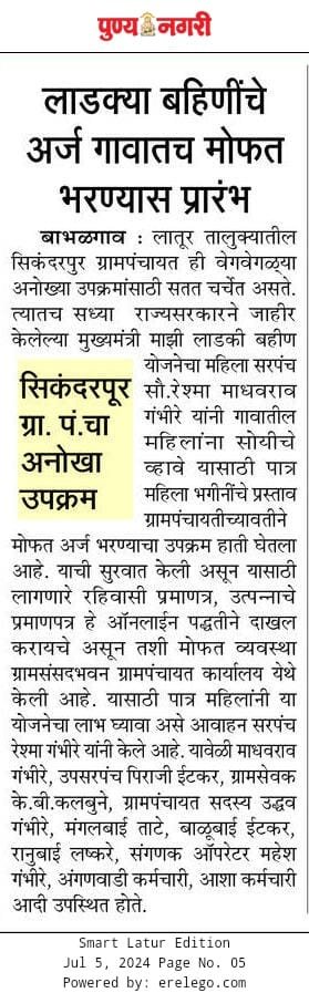 2021 वर्षा पासुन आजतागायत ग्रामस्थांच्या मोलाच्या सहकार्याने या कालावधीमध्ये “ महात्मा गांधी रोजगार हमी योजना व जनसुविधा योजनाचे अभिसरून करुन लातूर जिल्ह्यातील सिकंदरपूर येथे निर्मिती केलेल्या ग्राम संसद भवनचा पायलट प्रकल्प असेल, तसेच कमी कालावधीत आदर्श गावच्या दिशेने वाटचाल करण्याचा संकल्प, स्मार्ट विल्हेज पुरस्कार तसेच, संत गाडगे महाराज स्वचतेचा जिल्हा, विभाग स्तरीय पुरस्काराचा बहुमान मिळवत स्तनदा मातांना बसण्याचा आरामदायी कक्ष, बोलकी शाळा बोलकी अंगणवाडी, सौर ऊर्जा ग्रामससंद , पेपरलेस ग्रामससंद , रेंनहार्वेस्टिंग प्रकल्प, बायोगॅस प्रकल्प, वैकुंठधाम शमशान भूमीत मिया वाकी वृक्ष लागवड, बिहार पॅटर्न प्रमाणे वृक्ष लागवड व व्यवस्थित संगोपन, घंटागाडीच्या माध्यमातूनओला व व सुका कचरा व्यवस्थापन, हात धुण्यासाठी हॅन्ड स्टेशन, स्वच्छ आरो प्लांट पाणी व्यवस्थापन, शेतकऱ्यांना मोफत जनावराचे दाखले, रोजगार हमी योजनेतून शेतकऱ्यांना गायीचे गोठे, निराधार, अपंग, विधवा, महिला यांना मानधन योजना, महिला बचत गट यांची कार्यशाळा व रोजगार निर्मिती , शेतकरी- पुरुष बचत गट, बालविवाह बंदी कायदा अमलबजावणी , गावात दारूबंदी , कुपोषण , विध्यार्थी, शेतकरी - शेतमजूर, जेष्ठ नागरिकांसाठी पारदर्शक पद्धतीने योजना राबविण्यात येत असलेल्या अनेक नावीन्य पूर्ण उप्रक्रम राबवल्यामुळे..