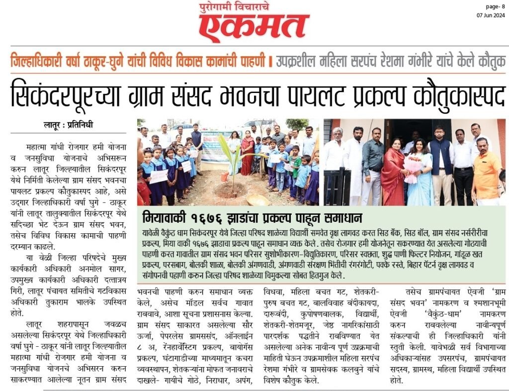 जिल्हाधिकारी वर्षा घुले ठाकूर यांनी सिकंदरपूर येथे साकारण्यात आलेल्या नूतन ग्राम संसद भवन ची पहाणी करून समाधान व्यक्त केले