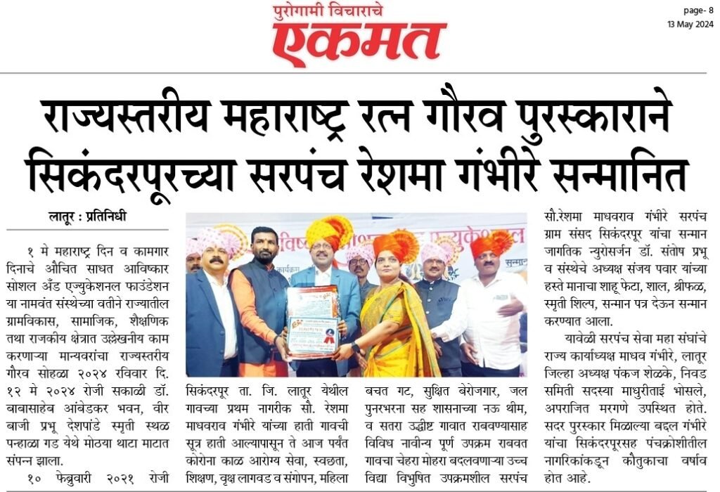 - ग्रामपंचायत सिकंदरपूरच्या महिला सरपंचांस *रयत प्रतिष्ठान* महाराष्ट्राच्या वतीने जिल्हा स्तरीय मानाच्या *ग्रामरत्न पुरस्काराने* मान्यवारंच्या हस्ते सन्मानित करण्यात आले.